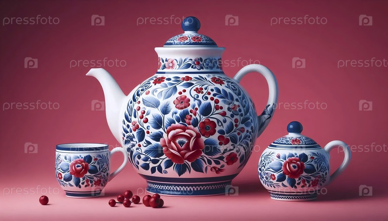 Российский флаг в сине-белом фарфоре Гжеля, Ai generated image