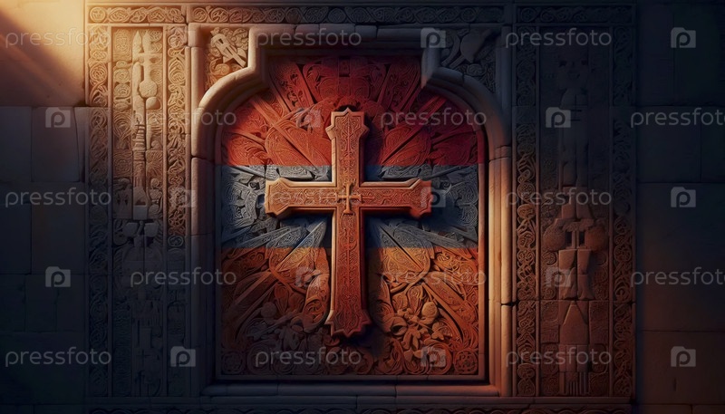Армянский флаг в сложных каменных крестовых камнях хачкаров, Ai generated image