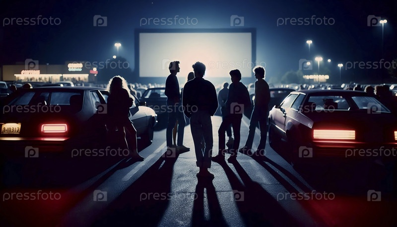 Группа друзей, сидящих на капоте автомобиля и слушающих музыку из бумбокса в драйв-ин-кинотеатре, Ai generated image
