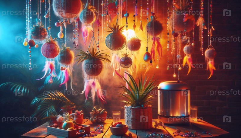 Интерьер в стиле бохо, стеклянные террариумы с воздушными растениями Tillandsia и увлажнителем, Ai generated image
