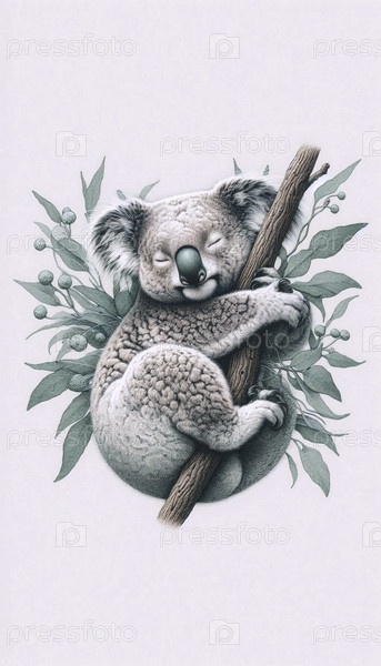 Коала обнимает ветвь эвкалипта чернила рисование художественная печать, Ai generated image