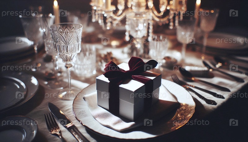 Простой белый макет подарочной коробки с широкой меховой лентой, расположенной посреди богато установленного праздничного обеденного стола перед прибытием гостей, Ai generated image