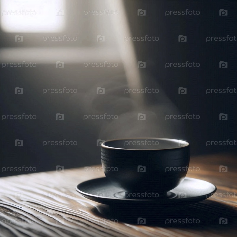 Черный фарфоровый кофеварка и макет тарелки на темноокрашенном дубовом столе, Ai generated image
