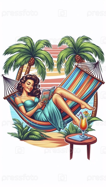 Пин-ап девушка в гамаке между двумя пальмовыми деревьями, читает журнал, Ai generated image