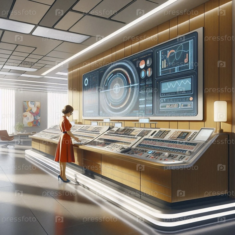 Просторный, минималистичный офис, где секретарша управляет большой футуристической компьютерной консолью с множеством кнопок и огней, Ai создал изображение