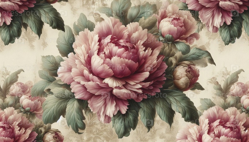 Бесшовный узор винтажных пионьев, Ai generated image