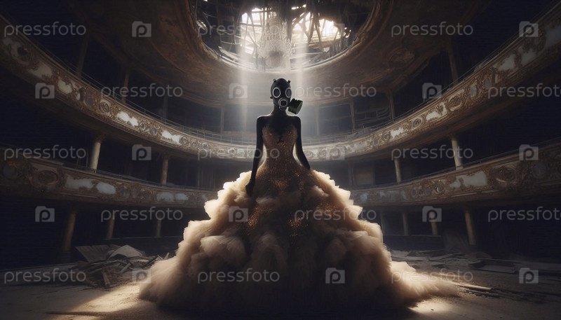 Женщина в газовой маске и вечернем платье в заброшенной опере, Ai generated image