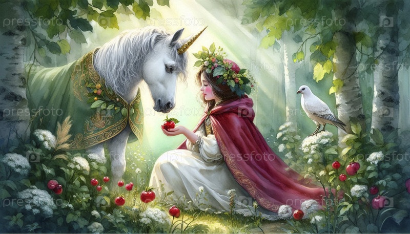 Принцесса и единорог Делятся акварельной живописью Берри, Ai generated image A