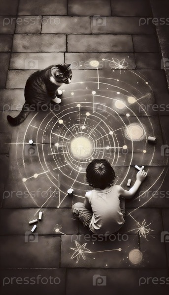 A cat observing a child's earnest sidewalk chalk universe, Ai generated image Кошка наблюдает за ребенком на тротуаре