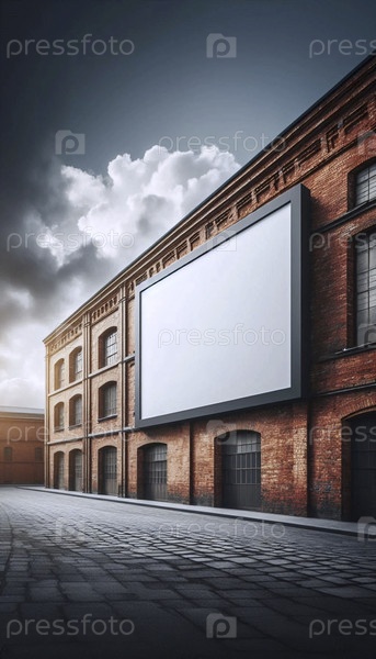 Из пустого макета прямоугольной рекламной доски на кирпичном фасаде промышленного здания Ай создал изображение