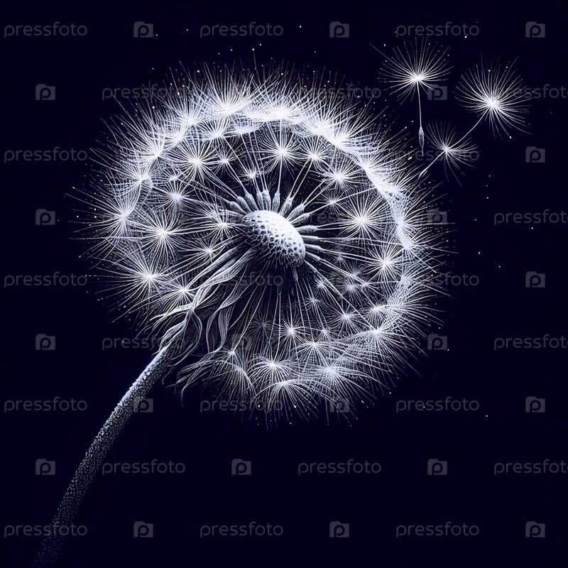 Single Dandelion Seed Head A ink drawing art print on black, Ai generated image Глава чернил рисунок художественная печать на черном цвете, создано изображение