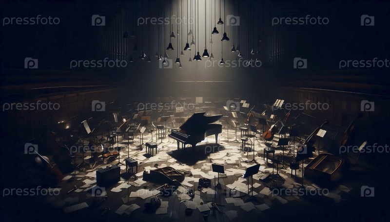 Более широкий снимок всей слабо освещенной ямы, чашки на пианино, брошенные инструменты