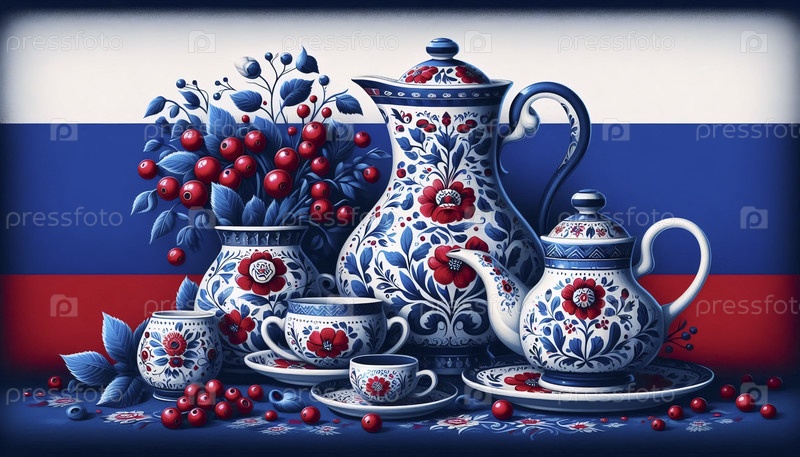 Российский флаг в сине-белом фарфоре Гжеля, Ai generated image