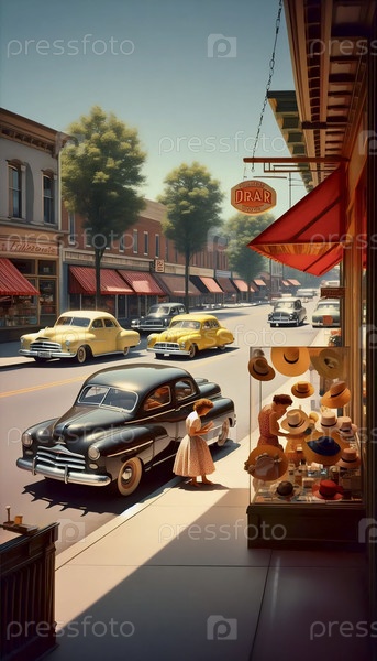 Живая сцена на главной улице США, с парой модных витрин 1950-х годов для покупок под полосатыми тентами, Ai generated image