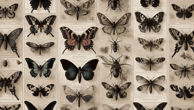 A botanical pattern Butterflies Beetles Vintage Insects, Ai generated image Ботанический шаблон Бабочки жуки Винтажные насекомые, Ай создал изображение