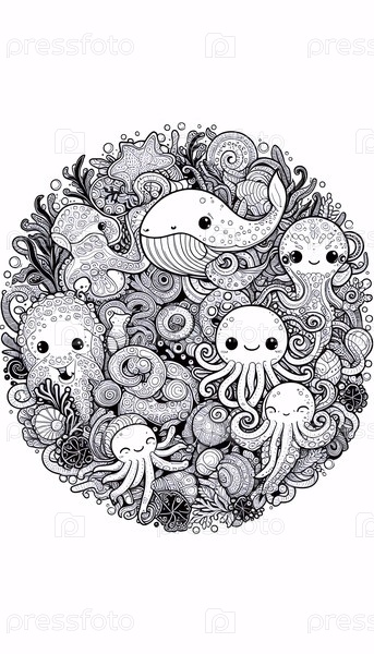 A kawaii ocean creatures цветная страница в круговом формате, Ai generated image