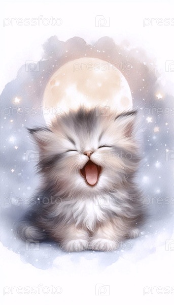 Мечтательный котёнок с акварельным художественным принтом Yawn, Ai generated image