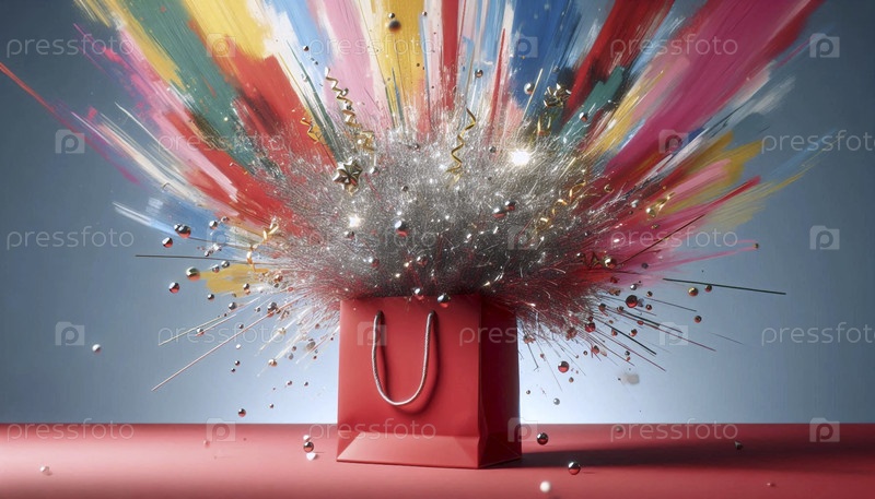 Простой бумажный макет подарочной сумки, переполненный нитями серебряного и золотого тинзеля на красочном абстрактном фоне, Ai создал изображение