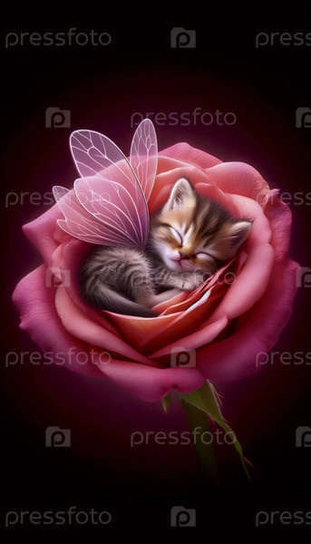 Крошечная фея-кошка спит в цвете, Ai generated image