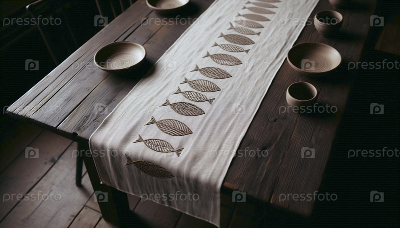 Шелковый беговой стол с вышитым хлебом и рыбой, Ai generated image
