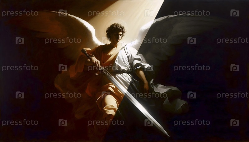 Ангел как небесный воин, Караваджо chiaroscuro, Ai generated image