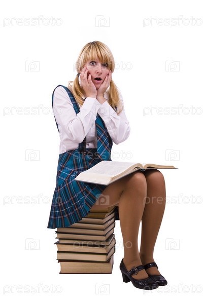 Старшеклассник в форме сидит на стопке книг и учится