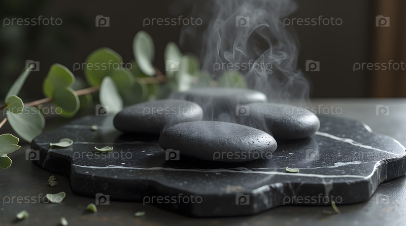 Пар поднимается с нагретых базальтовых камней, изображение создано искусственным интеллектом