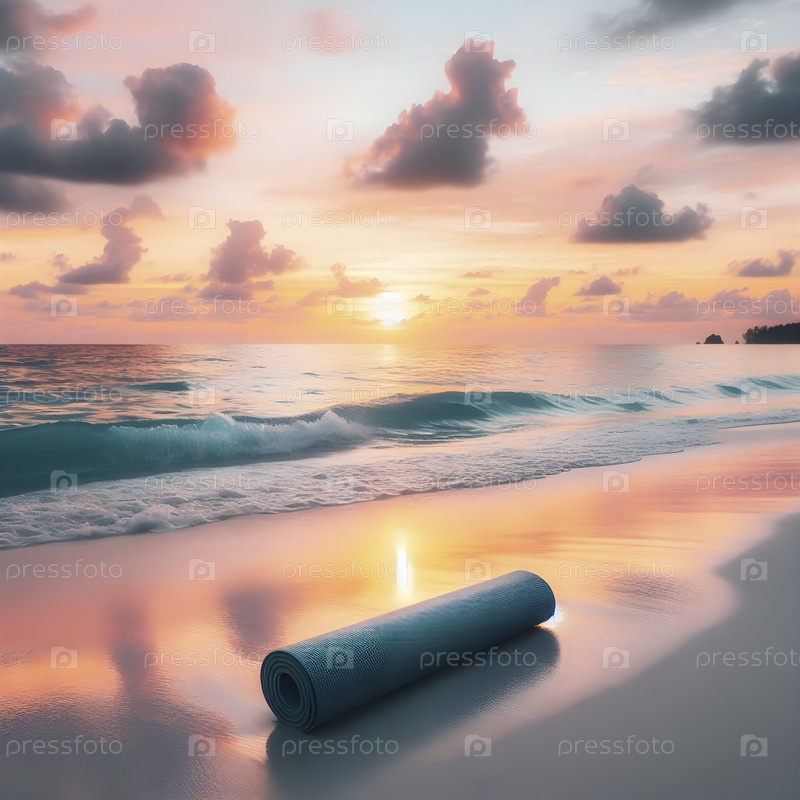 Одинокий йога-мат на белом песчаном пляже при закате, Ai created image