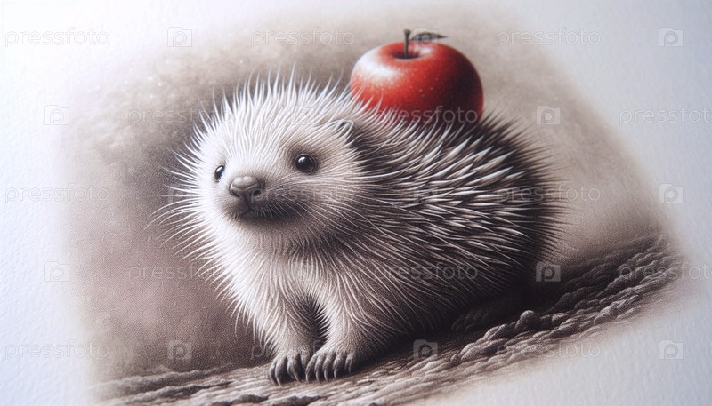 Маленький Козерог с яблоком на перьях чернил рисует художественную печать, Ai generated image