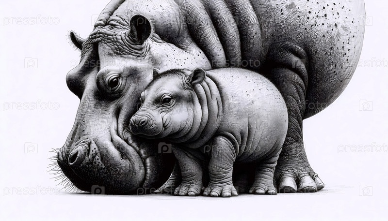 Baby Hippo чернила рисования художественная печать, Ai generated image