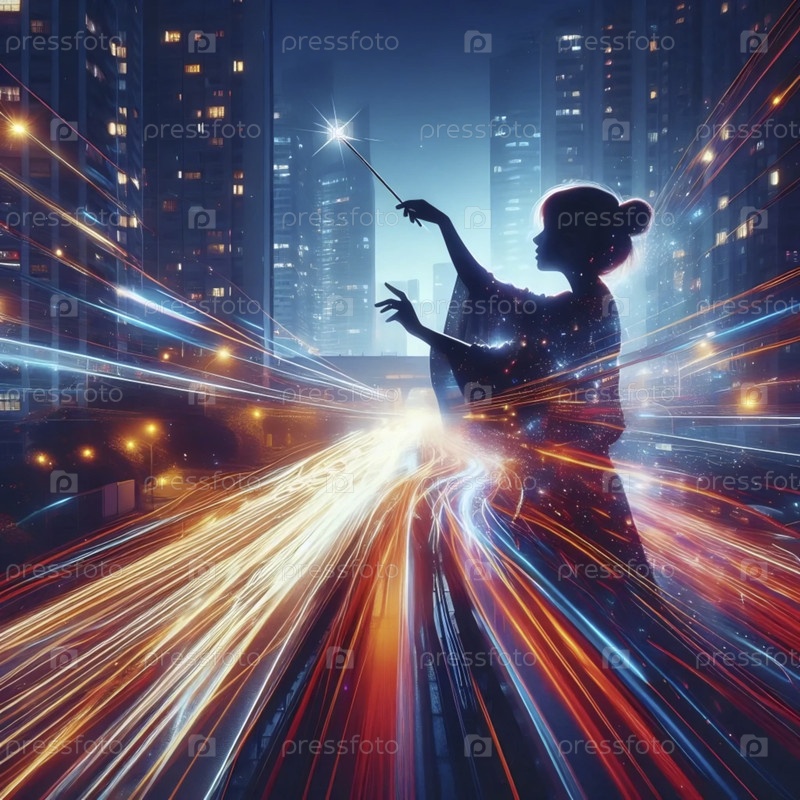 Девушка дирижирует симфонией городских огней с помощью искры, Ai generated image