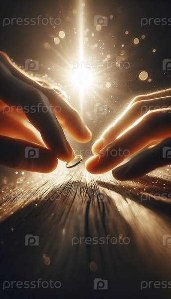 Интимный момент предложения, сосредоточенный исключительно на руках и обручальных кольцах при закате солнца, Ай создал изображение