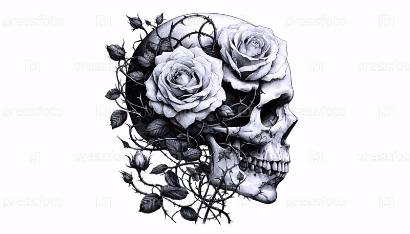 A Floral Skull ink drawing art print, Ai generated image Искусственная печать с чернилами цветочного черепа