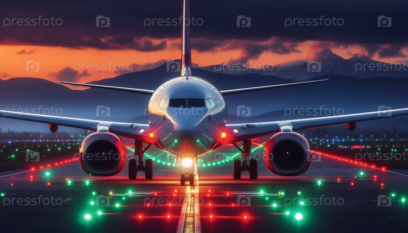 Самолет с включенными навигационными огнями в сумерках, Ai generated image