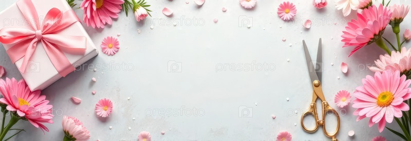 Розовые герберы, подарочная коробка, ножницы на бетонном фоне. баннер с копировальным пространством