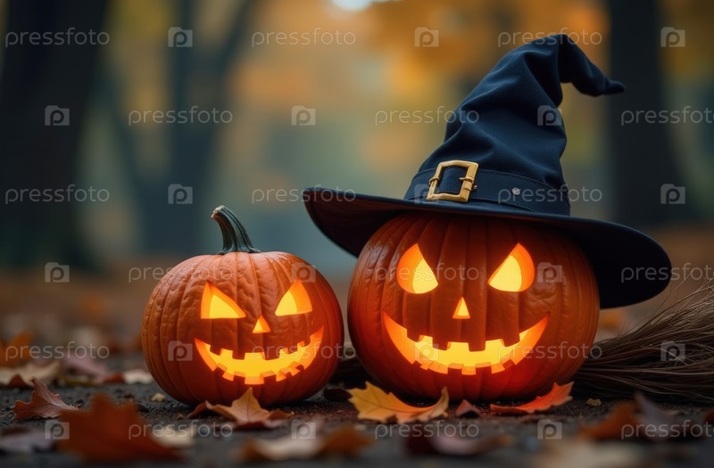 Хэллоуин. зловещие светящиеся тыквы в черной шляпе в осеннем лесу, копировальное пространство