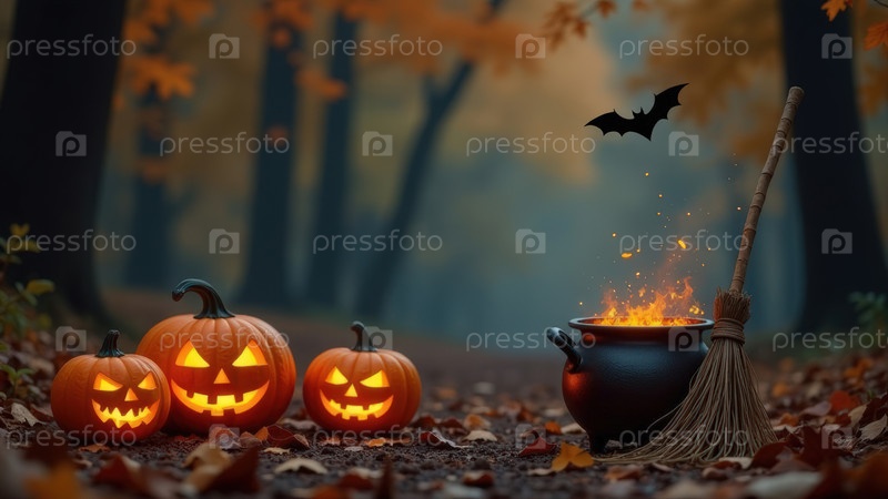 Колдовский котел с апельсиновым оттиском, метлой, летучей мышью и зловещими светящимися тыквами в осеннем лесу