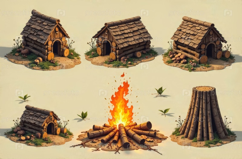 Деревянные хижины, ствол с тенью от горящего огня в форме звезды