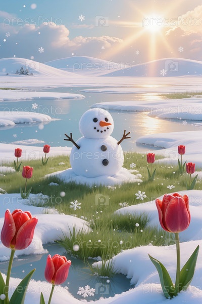 Улыбающийся снеговик под весенним солнцем на фоне весеннего таяния, тающего снега, зеленой травы, цветущих тюльпанов и озера