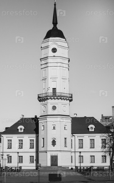 Черно-белая фотография Городской ратуши на площади Славы в Могилеве, Беларусь