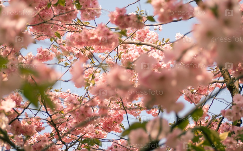 Бело-розовое цветение деревьев вишни весной на фоне неба (Сад Дружбы в Санкт-Петербурге)