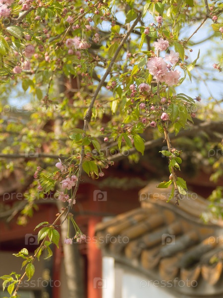 Цветение деревьев вишни (сакуры) и жасмина весной в солнечный день (Сад Дружбы в Санкт-Петербурге) на фоне китайской беседки (бело-красной пагоды)