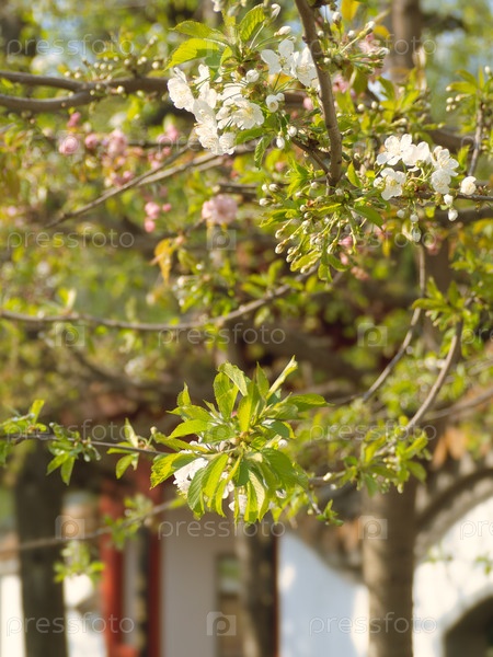 Цветение деревьев вишни (сакуры) и жасмина весной в солнечный день (Сад Дружбы в Санкт-Петербурге) на фоне китайской беседки (бело-красной пагоды)