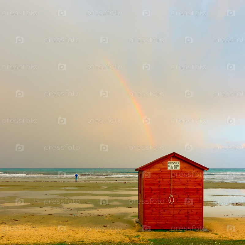 В межсезонье - пустой морской пляж и радуга в небе