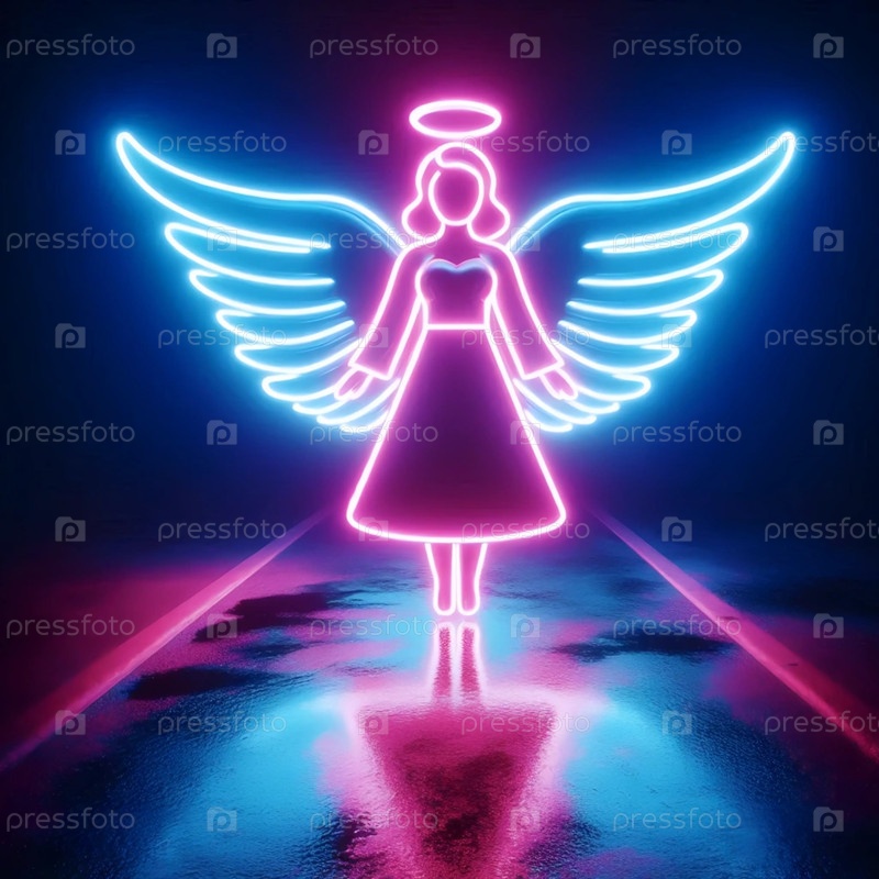 Неоновый знак ангела мерцает над дождливой улицей, Ai generated image