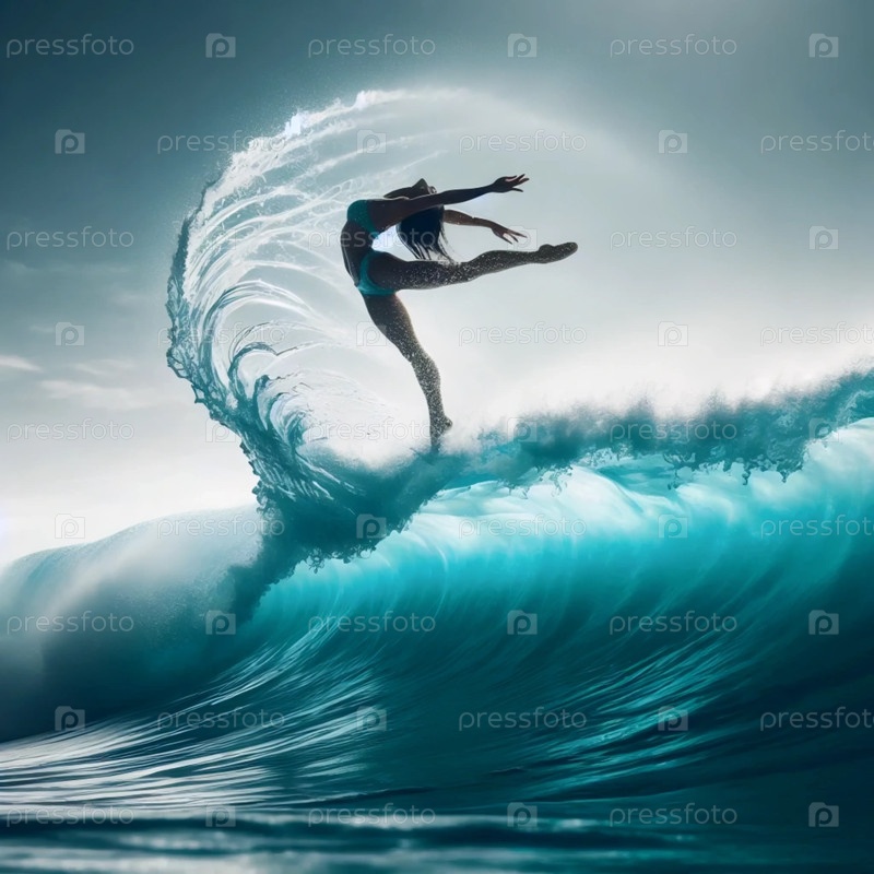 Балерина в точке на вершине разбивающейся океанской волны, Ai generated image