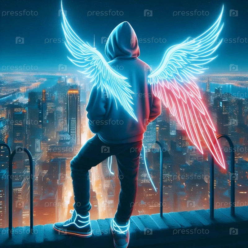 Современный ангел в городской уличной одежде, летящий над мегаполисом, Ai generated image