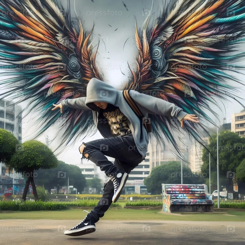 Скейтбордер в воздухе с ангелскими крыльями в стиле граффити, Ai generated image
