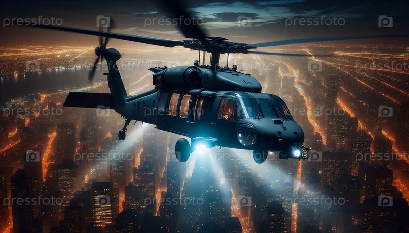 Вертолет со светофором над ночным городом, Ai generated image