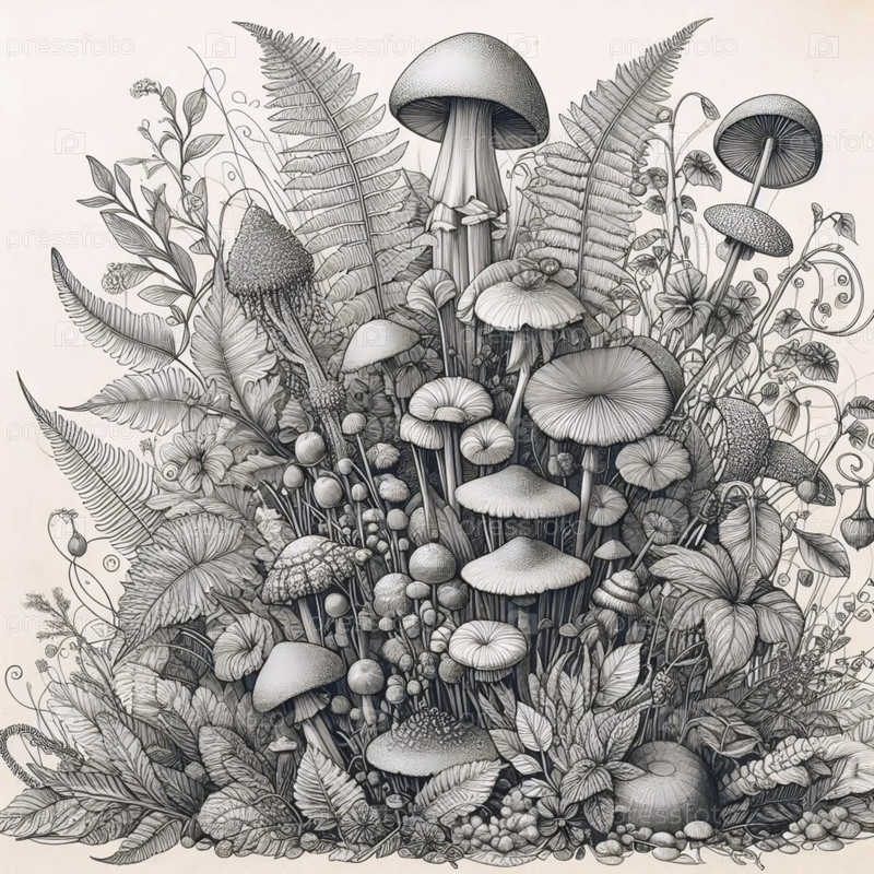 Ботаническая иллюстрация лесного ландшафта, Ai generated image